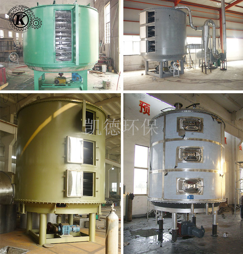 Wet material continuously fed from the feeder on the upper portion of the first layer of drying plate dryer, rake leaves witha rake arm rotary movement so continuously rake leaves turn copied material. Index material along the spiral flow through the disk surface drying, the material was dried in a small disk is transferred to the outer edge and the outer edge of the disk falls below the outer edge of the large drying, drying on a large plate material moved inward and drop from the middle discharge port falls under a layer of small drying pan. Size drying plates are arranged alternately, the material can be continuous through the whole dryer. Heating medium through the hollow of the dry plate, heating medium in the form of saturated steam, hot water or thermal oil heating medium enters from one end of the dry plate exported from the other end. Dried materials fell on the bottom of the housing from the last layer of drying plate, the last being transferred to rake leaves out of the discharge port. The moisture escaping from the material discharged from the humidity on the top cover of the mouth, a vacuum-type plate dryer moisture on the top cover of the pump out of the mouth. Discharged from the bottom of the dry materials can be packed directly. By finned heater with addition, solvent recovery condensers, baghouse, dry material backmixing agencies, induced draft fan and other auxiliary equipment, can increase its drying capacity, dried paste and heat sensitive materials can be easily recycled The solvent and capable of heat decomposition and reaction. & Nbsp;
